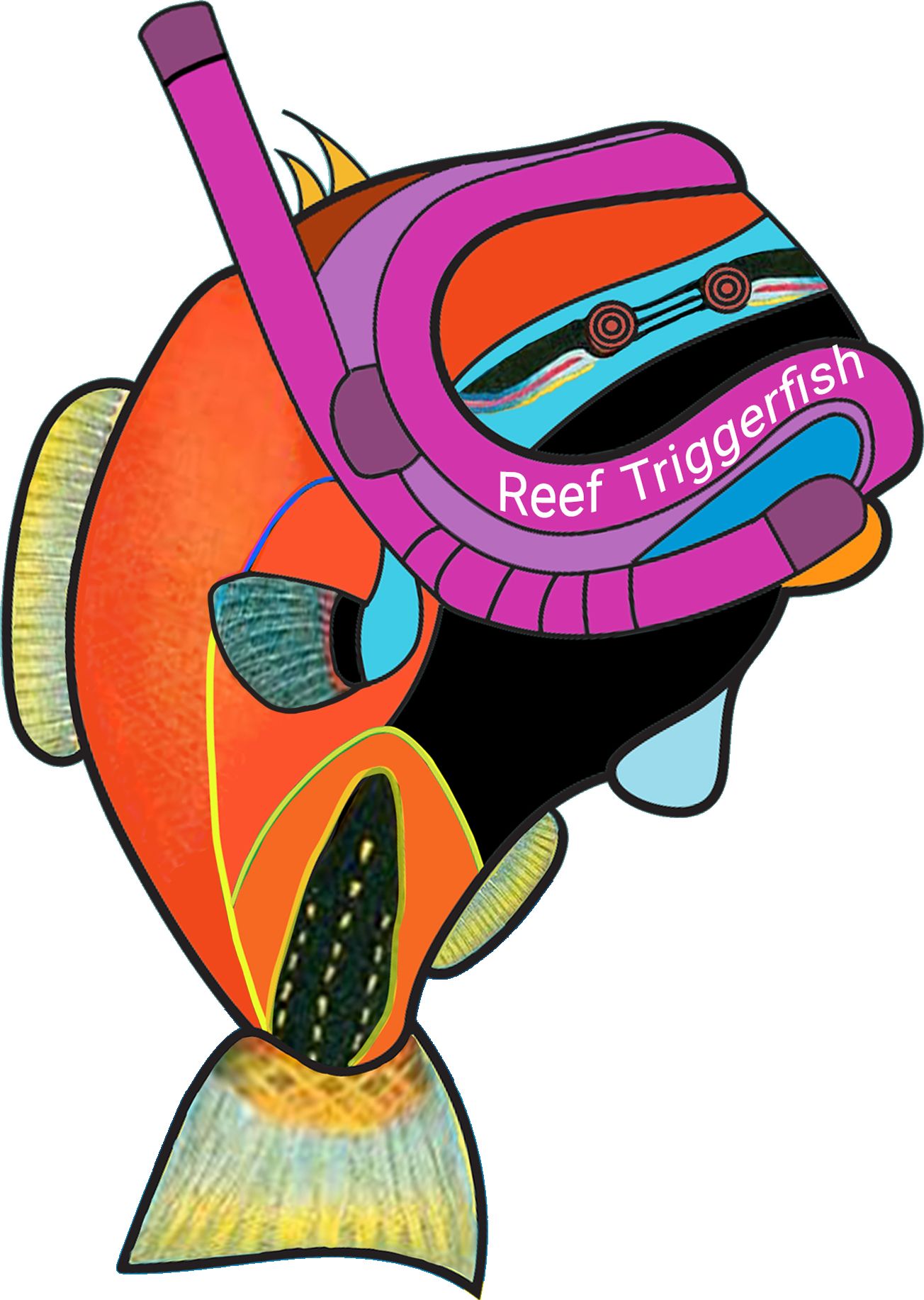 A playful series featuring the Reef Triggerfish with a snorkeling mask and the Clown Triggerfish holding a surfboard, set against a sea green background with textured coral reefs. The design blends vibrant, flat colors and real fish textures, capturing the fun spirit of Maui’s marine life and activities.