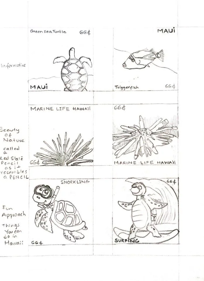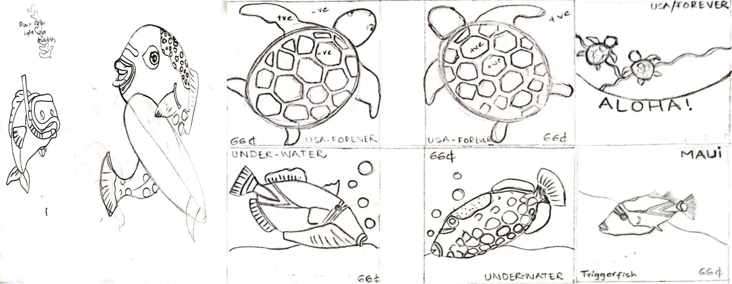 Marine Life Maui – Postage Stamp Concept Sketches exploring sea turtles, fish, coral, and ocean activities.”