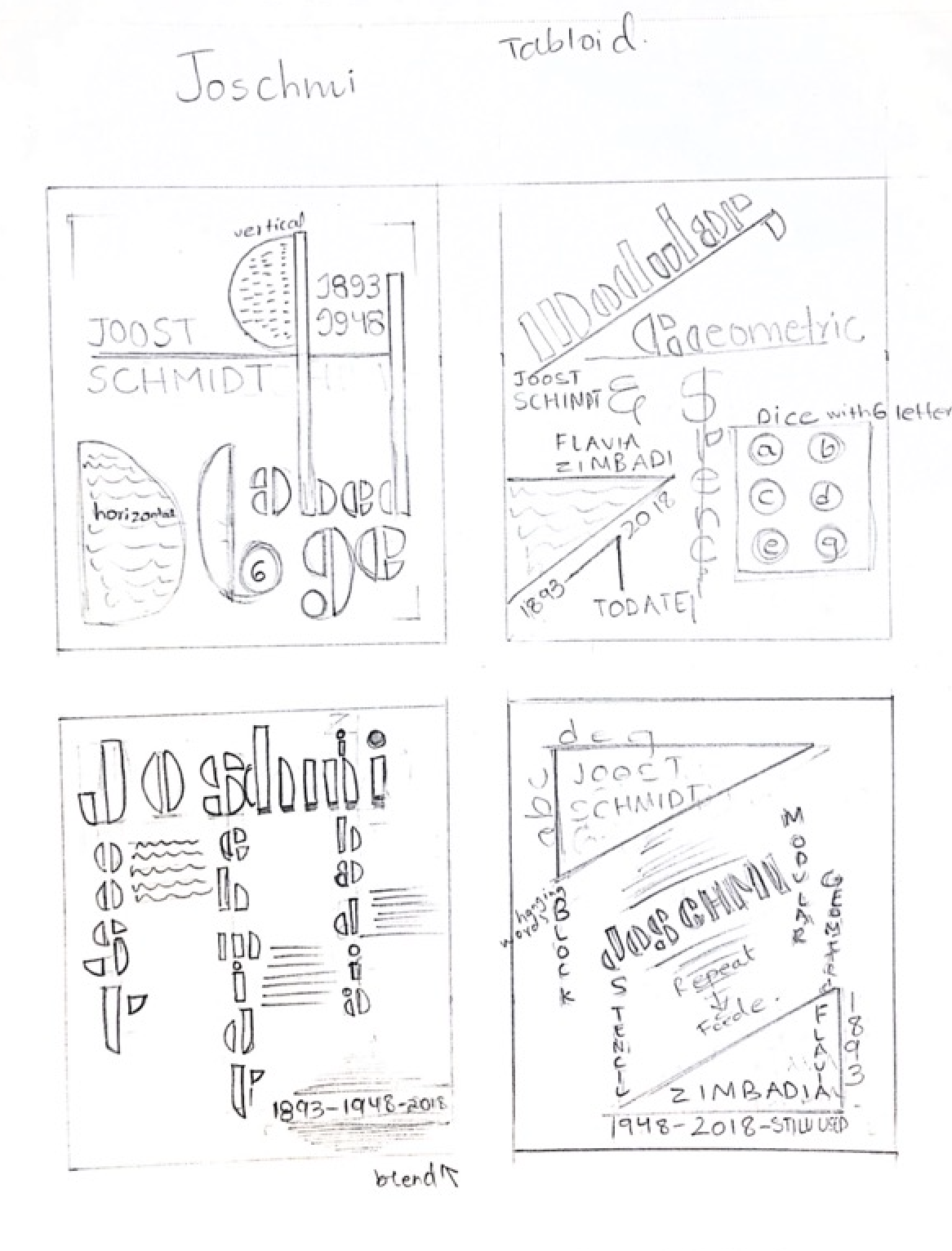 Process sketches exploring layout concepts for a tabloid poster featuring the Bauhaus-inspired typeface Joschmi, designed by Flavia Zimbardi in honor of Joost Schmidt. The thumbnails experiment with vertical and diagonal compositions, modular blocks, stencil forms, and geometric structures, reflecting the typeface’s modernist roots.