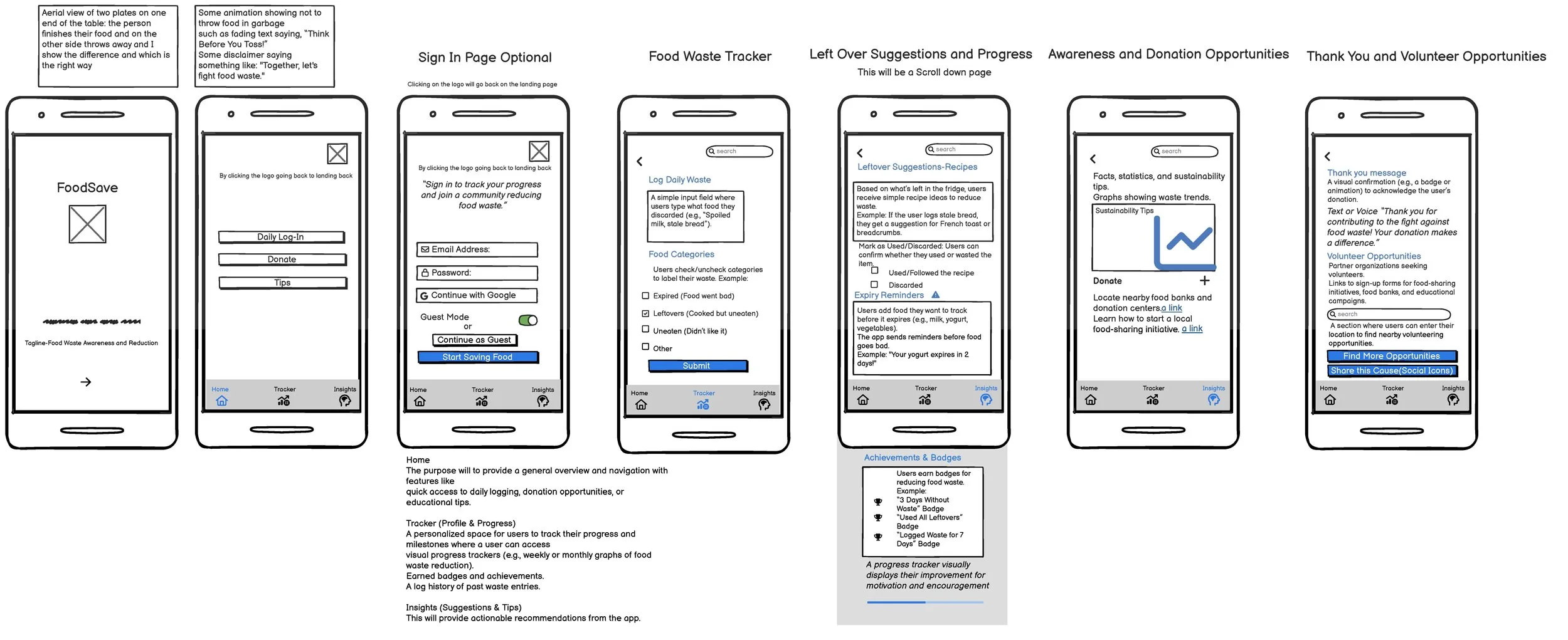 “FoodSave app wireframes: A clean, intuitive design to track food waste, suggest recipes, and promote donation opportunities.”